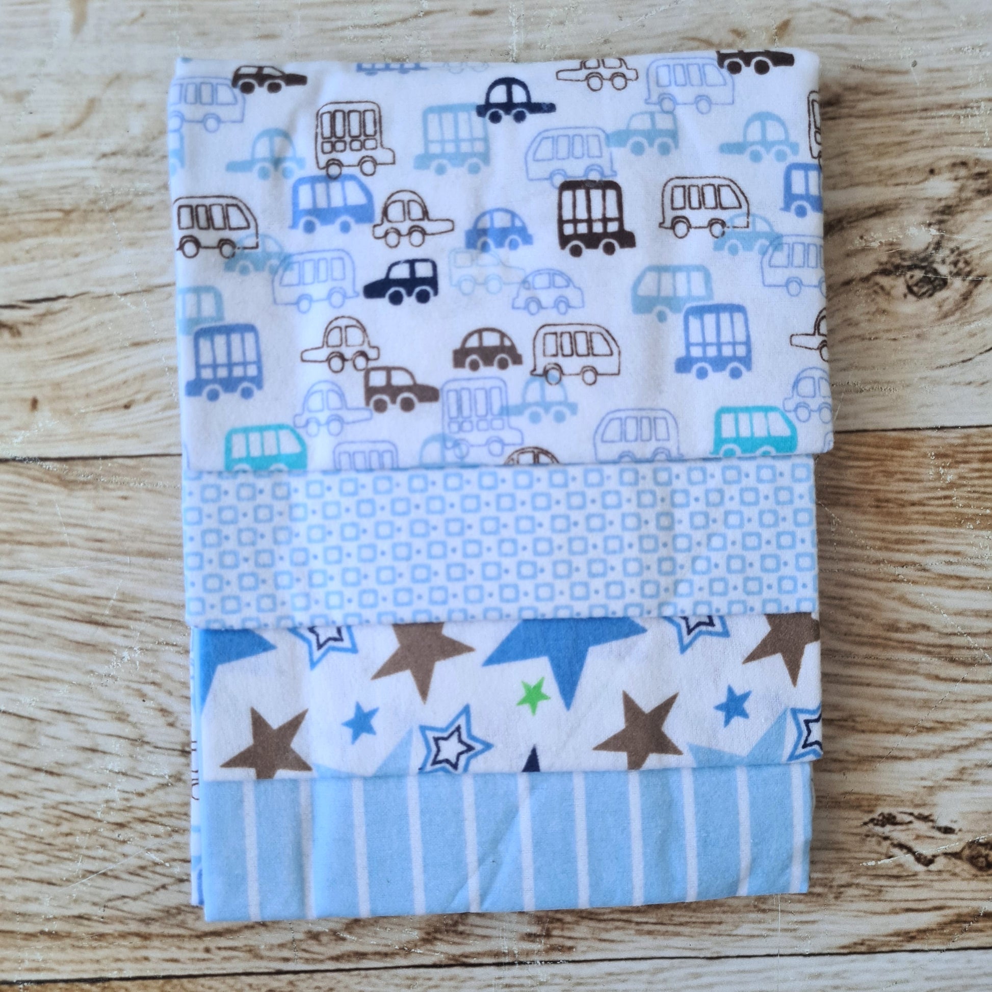 Set 4 tutos 100% algodón para bebé - diseños autitos azules
