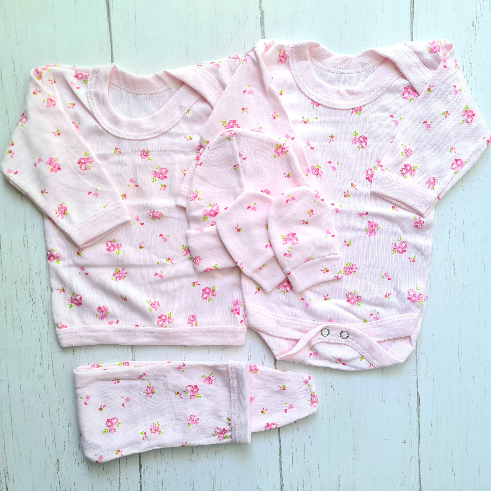 Set ajuar de 5 piezas 100% algodón para bebé - diseño rosa floreado